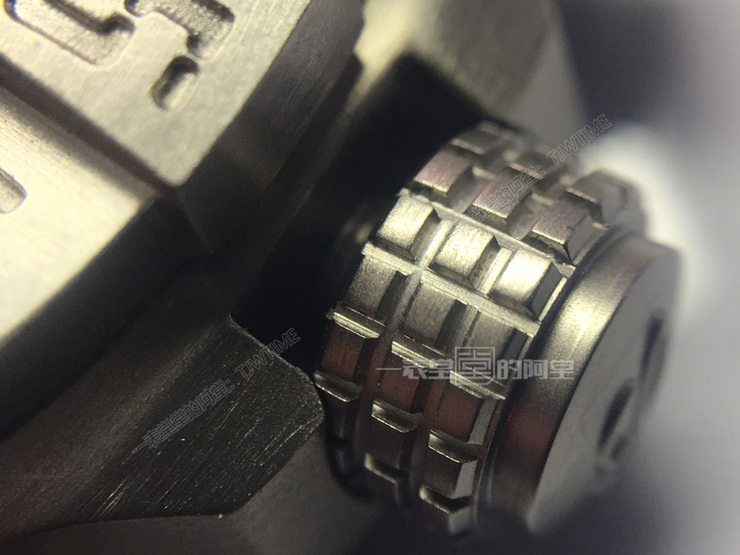 3点位的表冠把头刻字大小和细节处理基本达到一致,计时按键大小和正品一致,上面的网格处理到位,基本还原了正品的深度,边缘打磨也很光滑。