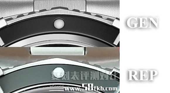 通过这张图片能够非常直观的看到正品和V6竟潜的外圈字体差不多是一致的,不同的拍照角度以及环境光线导致了复刻表的字体粗细发生了变化而已。再就是外圈的齿牙复刻表也和正品是一样的,刻度线对应的位置做了抛光处理,其它部位则同正品一样进行了哑光处理。在这里同样存在一个槽点,40刻度的位置陶瓷圈出现了溢胶问题。